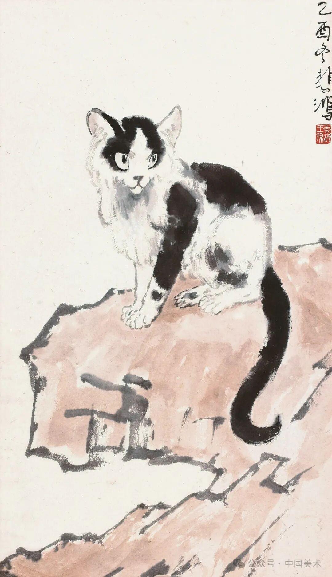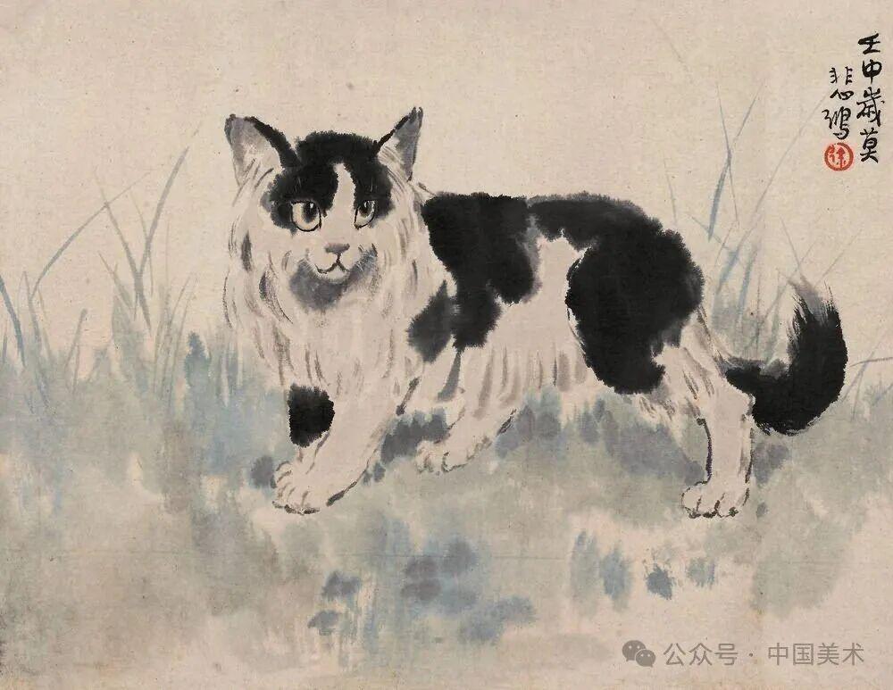 众所周知,徐悲鸿擅长画马。而在马之外,他画得最多的就是猫。徐悲鸿创作的《猫》系列作品是其花鸟动物画的重要组成部分。《猫》延续了徐悲鸿“中西融合”的创作道路。猫的形体结构、肌肉张力,展现出西方写实主义的严谨功底;而毛发、枝叶与石块的背景,则是中国写意笔墨的自由挥洒。写实与写意的结合,使画面具有真实可信的张力。西方素描塑形的精确,与东方笔墨的灵动在此交融,形成了一种独属于徐悲鸿的艺术语言。