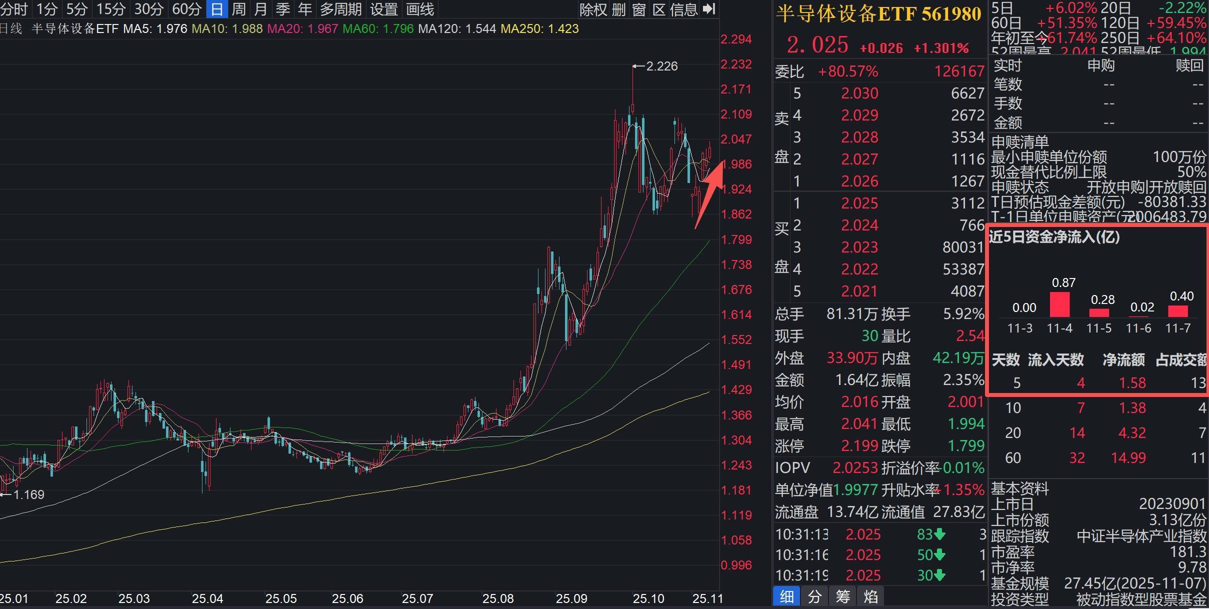 截止10:30,热门国产替代品种半导体设备ETF(561980)盘中涨超1.3%,日K冲击6连阳,近4日累计吸金共1.58亿元。成份股方面,神工股份、立昂微强势封涨停板,京仪装备大涨近15%,雅克科技涨超7%,珂玛科技涨超6%,华海清科、沪硅产业、中微公司、拓荆科技等多股拉升。
