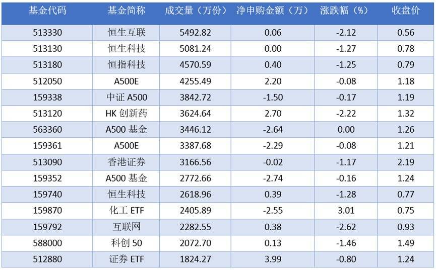 从成交量上来看,2025年11月07日成交量最大的是恒生互联(513330),成交量为5492.82万份。排名靠前的恒生科技(513130)、恒指科技(513180)、A500E(512050),成交量分别为5081.24万份、4570.59万份、4255.49万份。