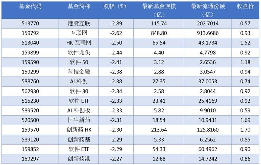 下跌方面,2025年11月07日跌幅最大的是港股互联(513770),跌幅达到2.89%。排名靠前的互联网(159792)、HK互联网(513040)、软件龙头(159899),跌幅分别为2.62%、2.50%、2.44%。