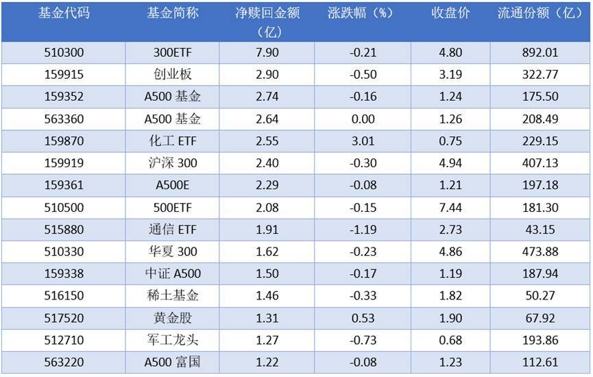 资金流出方面,2025年11月07日净赎回金额最多的是300ETF(510300),赎回金额7.90亿元。排名靠前的创业板(159915)、A500基金(159352)、A500基金(563360),赎回金额分别为2.90亿元、2.74亿元、2.64亿元。