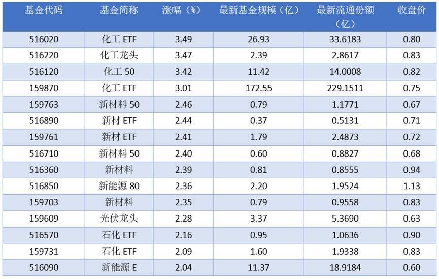 根据巨灵财经统计的数据显示,2025年11月07日场内ETF基金中化工ETF(516020)领涨,涨幅为3.49%,排名靠前的化工龙头(516220)、化工50 (516120)、化工ETF(159870),涨幅分别为3.47%、3.42%、3.01%。