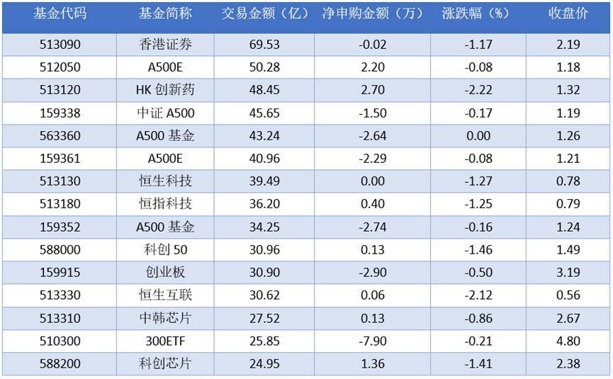 从成交金额上来看,2025年11月07日成交额最大的是香港证券(513090),交易金额69.53亿元。排名靠前的A500ETF(512050)、HK创新药(513120)、中证A500(159338),成交额分别为50.28亿元、48.45亿元、45.65亿元。