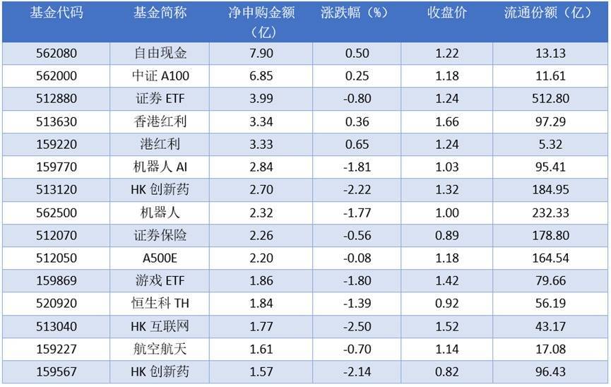 细分到资金流动情况上来看,2025年11月07日净申购金额最大的为自由现金(562080),当日净申购金额为7.90亿元。排名靠前的中证A100(562000)、证券ETF(512880)、香港红利(513630),申购金额为6.85亿元、3.99亿元、3.34亿元。