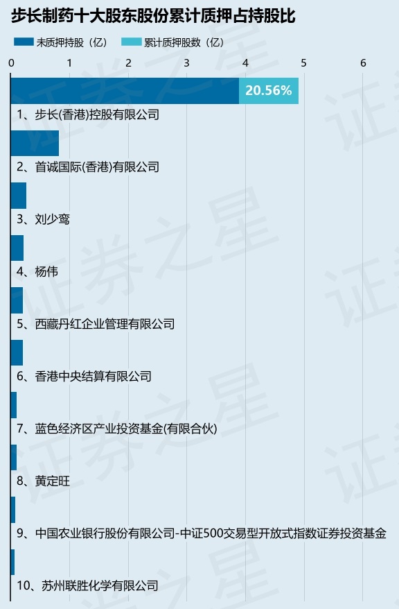 截止本公告日,股东步长(香港)控股有限公司已累计质押股份1.01亿股,占其持股总数的20.56%。本次质押后步长制药十大股东的累计质押股份占持股比例(占持股比例的计算以公司最新一期财务报表公布的十大股东的持股总数为基准)见下图: