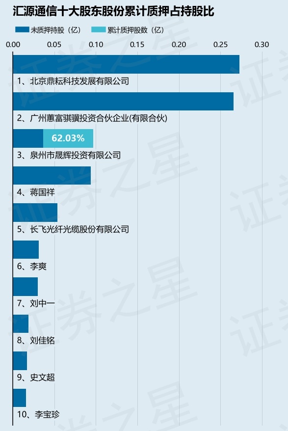 截止本公告日,股东泉州市晟辉投资有限公司已累计质押股份600.0万股,占其持股总数的62.03%。本次质押后汇源通信十大股东的累计质押股份占持股比例(占持股比例的计算以公司最新一期财务报表公布的十大股东的持股总数为基准)见下图: