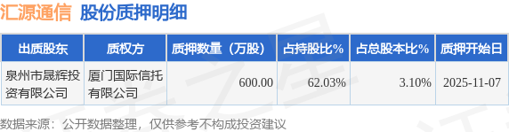 证券之星消息,汇源通信(000586)11月10日公开信息显示,股东泉州市晟辉投资有限公司向厦门国际信托有限公司合计质押600.0万股正规配资平台推荐,占总股本3.1%。质押详情见下表: