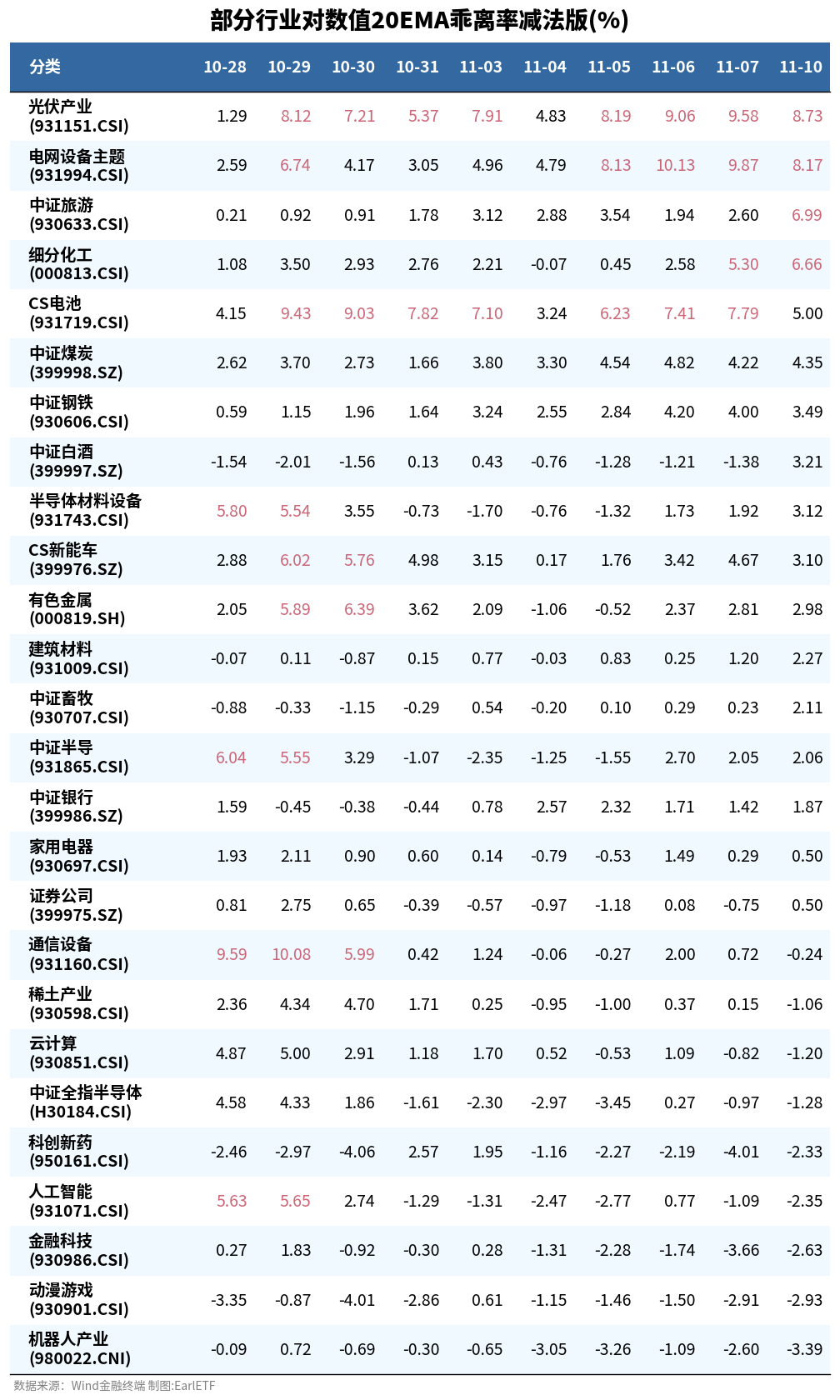 经过周一的上涨,从广发刘晨明提出判断主线风险的乖离率的来看,旅游和化工倒是站在了5%以上的甜点区。白酒起步过猛,均线形态还没跟上,只有3.21%。