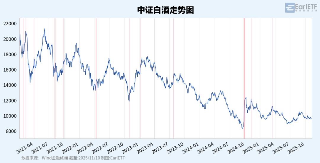 那么,中证白酒上涨5%意味着什么?拉了一张2021年白酒坚定后的走势,红色竖线就是当日出现单日上涨5%的交易日。