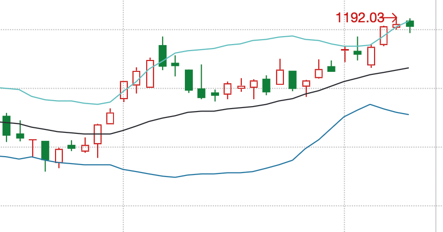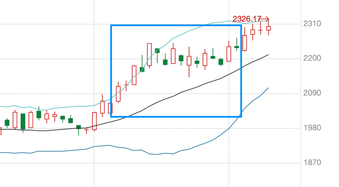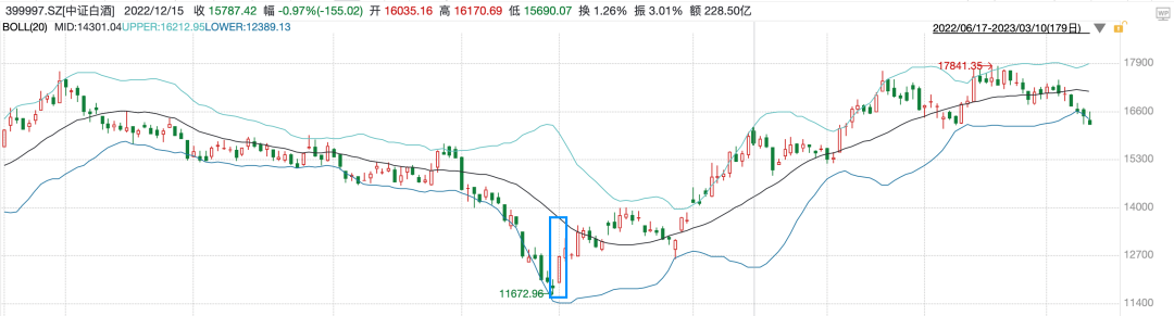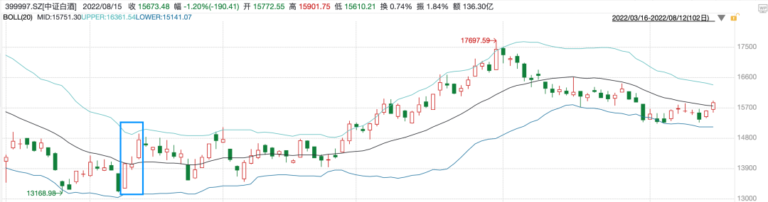 其实2022年4月的白酒也是如此,三天里面两根5%大阳线触及布林线上轨后,横盘许久底部逐步太高,然后再开始第二波。