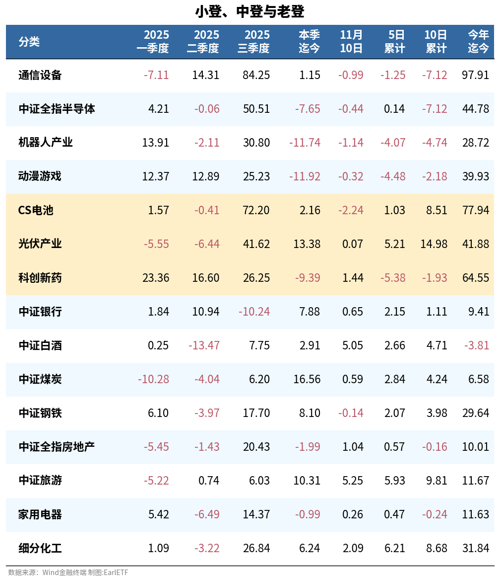 相比之下,小登股中的半导体、通信、机器人、动漫游戏,全数下跌。中登股中的电池此前表现甚好,周一也开始调整大跌2.24%,光伏算是勉强持平。反倒是科创新药,涨幅还算不错。